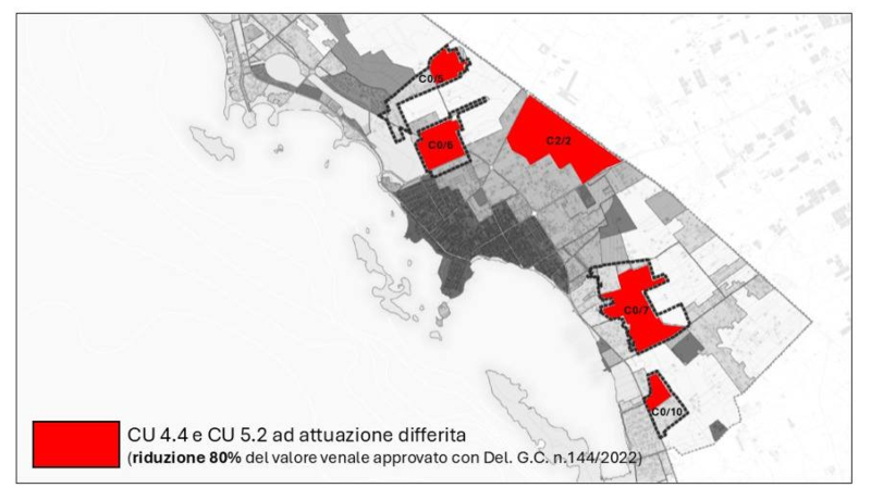-80% per le nuove aree indicate come CU 4.4 e CU 5.2 nella nuova Variante Generale a partire dall’adozione in Consiglio Comunale del 13/06/2025.