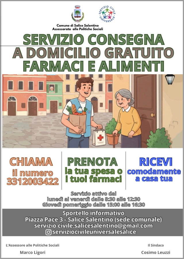 L’Amministrazione Comunale di Salice Salentino con l’Assessorato ai Servizi Sociali, promuove un importante servizio di prossimità dedicato all’acquisto e alla consegna a domicilio di alimenti, beni di prima necessità e farmaci, rivolto ai cittadini che si trovano in condizioni di fragilità o difficoltà.