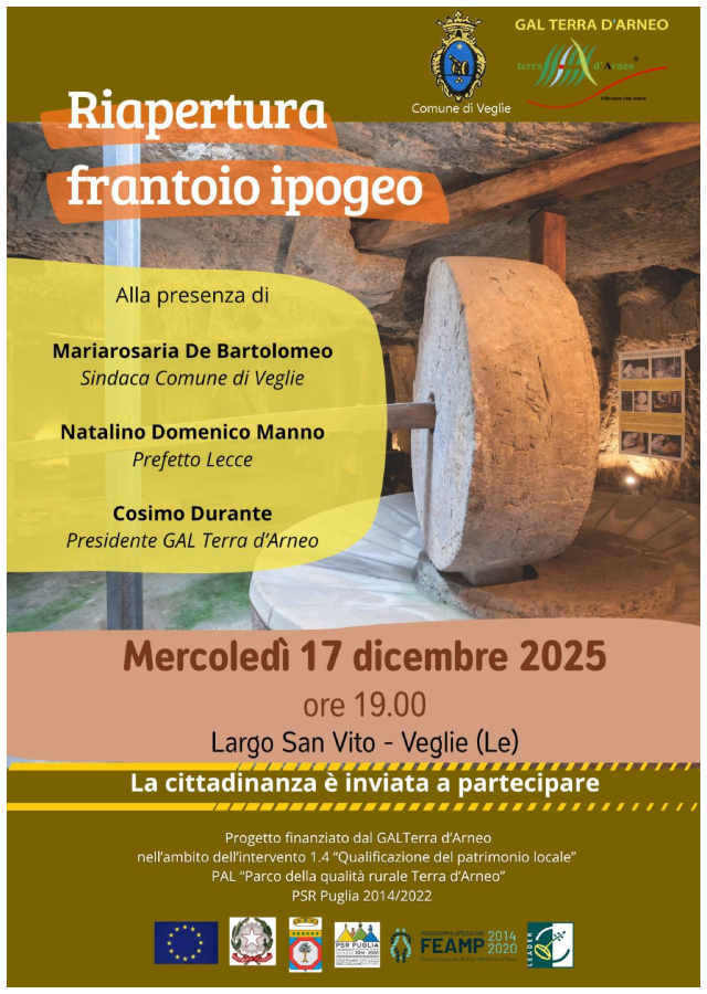 VEGLIE – Mercoledì 17 dicembre 2025, alle ore 19.00, riapre a Veglie il Frantoio Ipogeo di Largo San Vito alla presenza di S.E. il Prefetto di Lecce Natalino Domenico Manno e del Presidente del Gal Terra d’Arneo Cosimo Durante.