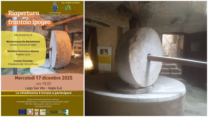 VEGLIE – Mercoledì 17 dicembre 2025, alle ore 19.00, riapre a Veglie il Frantoio Ipogeo di Largo San Vito alla presenza di S.E. il Prefetto di Lecce Natalino Domenico Manno e del Presidente del Gal Terra d’Arneo Cosimo Durante.