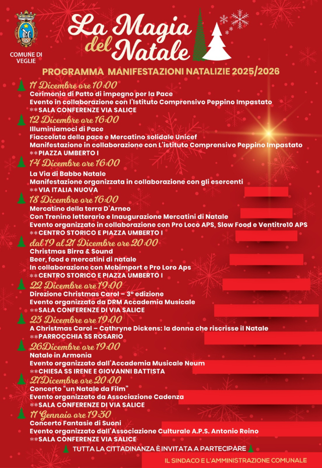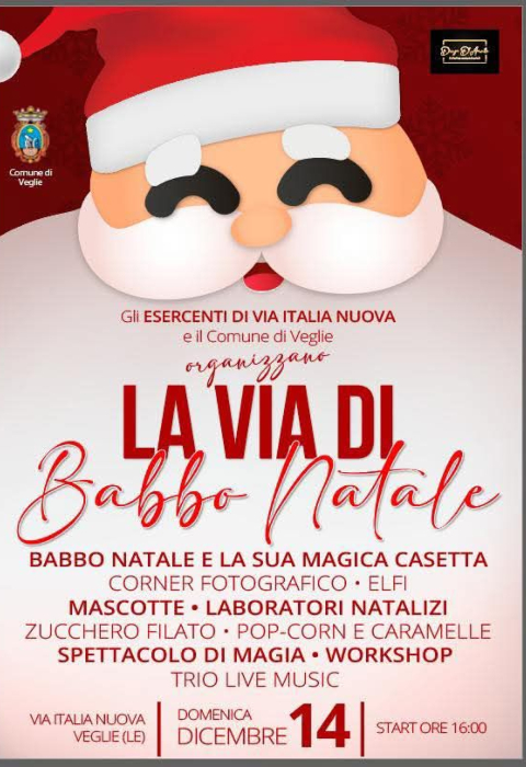 VEGLIE – Entra nel vivo il natale vegliese, con una serie di appuntamenti per grandi e piccoli che vanno dalla magia dei mercatini e dei villaggi natalizi alla musica, spettacolo, solidarietà e molto altro ancora.