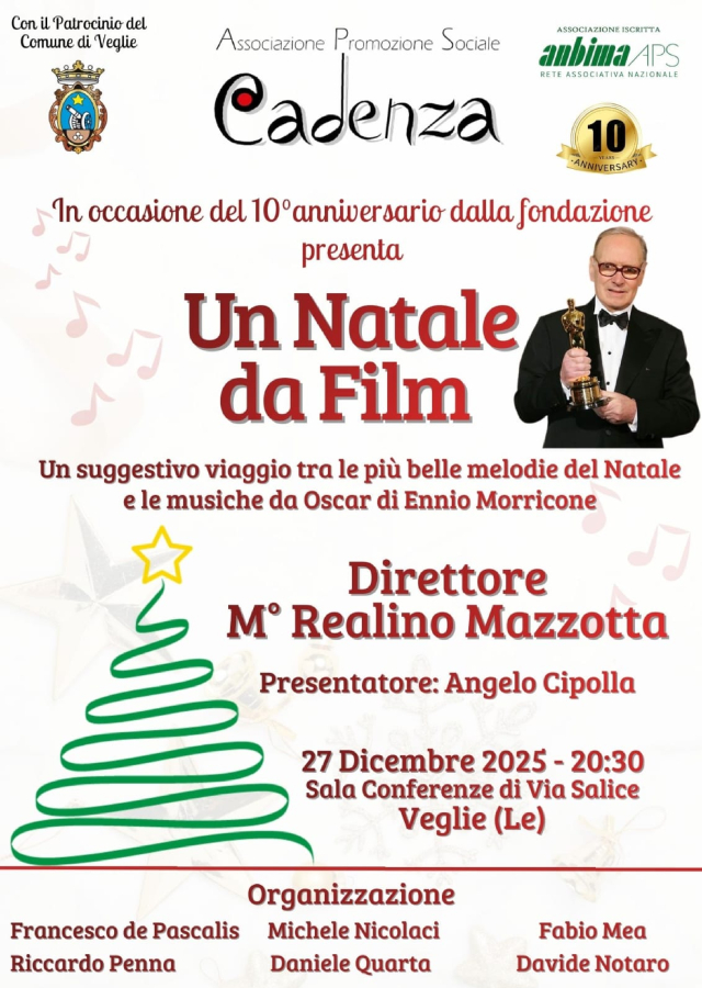 VEGLIE – Le festività natalizie a Veglie si arricchiscono di un appuntamento di grande fascino. L’Associazione Musicale Cadenza celebra il suo decimo anniversario con il concerto “Un Natale da Film”, un omaggio alle melodie natalizie più amate e alle straordinarie composizioni di Ennio Morricone.