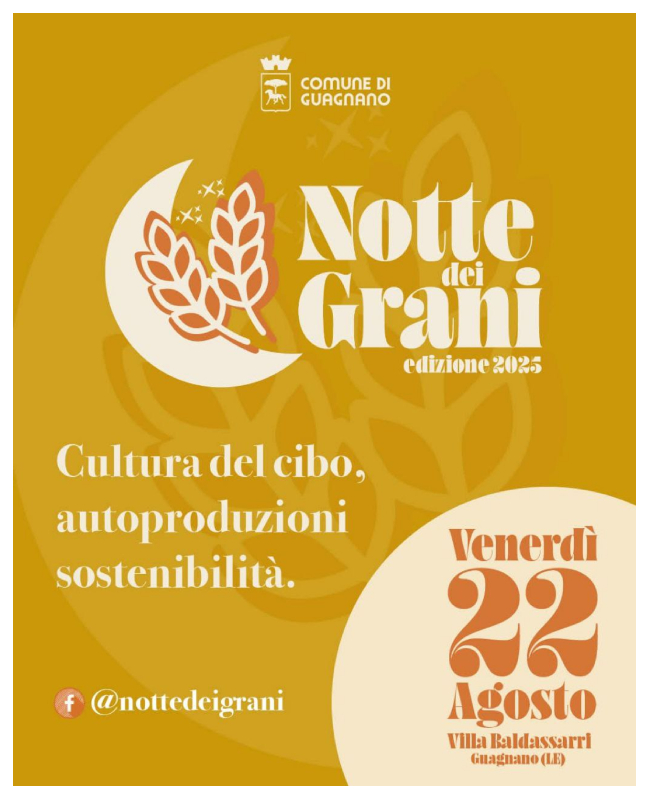 VILLA BALDASSARRI (GUAGNANO) – Il 22 agosto 2025 a partire dalle 18.00, Villa Baldassarri ospita la seconda edizione de “La Notte dei Grani”, un evento che mette al centro il tema del cibo come elemento della tradizione e come occasione per indagare il processo di trasformazione dei territori e lo vuole fare insieme alla comunità con laboratori, talk, performance, spettacoli clownerie e musica.