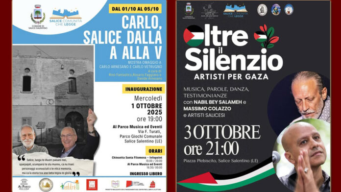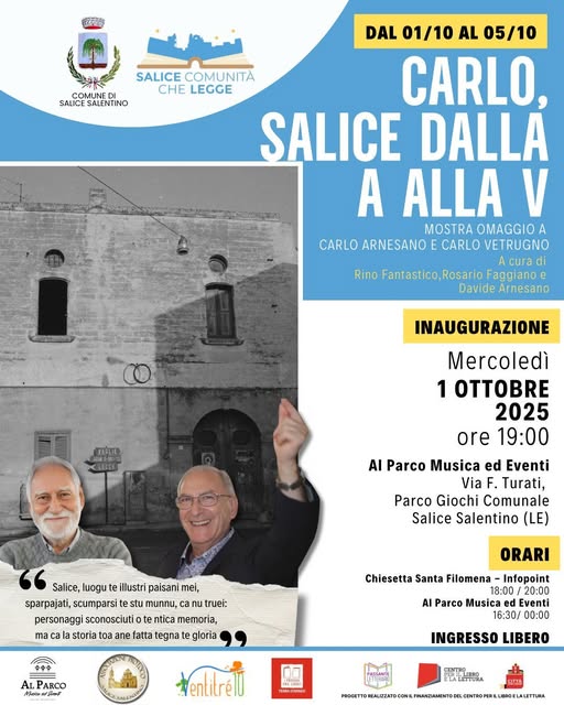 Dopo i primi due appuntamenti di fine settembre, si apre mercoledì 1 ottobre alle ore 19:00 con l’inaugurazione della mostra “Carlo, Salice dalla A alla V”, un omaggio ai grandi artisti locali Carlo Arnesano e Carlo Vetrugno, presso il Parco giochi comunale.