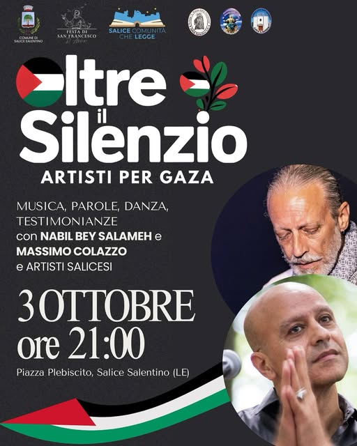 Venerdì 3 ottobre, alle ore 21:00, in Piazza Plebiscito, Nabil Bey Salameh e Massimo Colazzo presenteranno l’antologia “Il loro grido è la mia voce. Poesie da Gaza” (Fazi), accompagnata dal reading “Oltre il silenzio”, nell’ambito della manifestazione Oltre il silenzio – Artisti per Gaza. Una serata di parole, poesia e impegno civile con Nabil Bey Salameh, voce intensa e autentica.