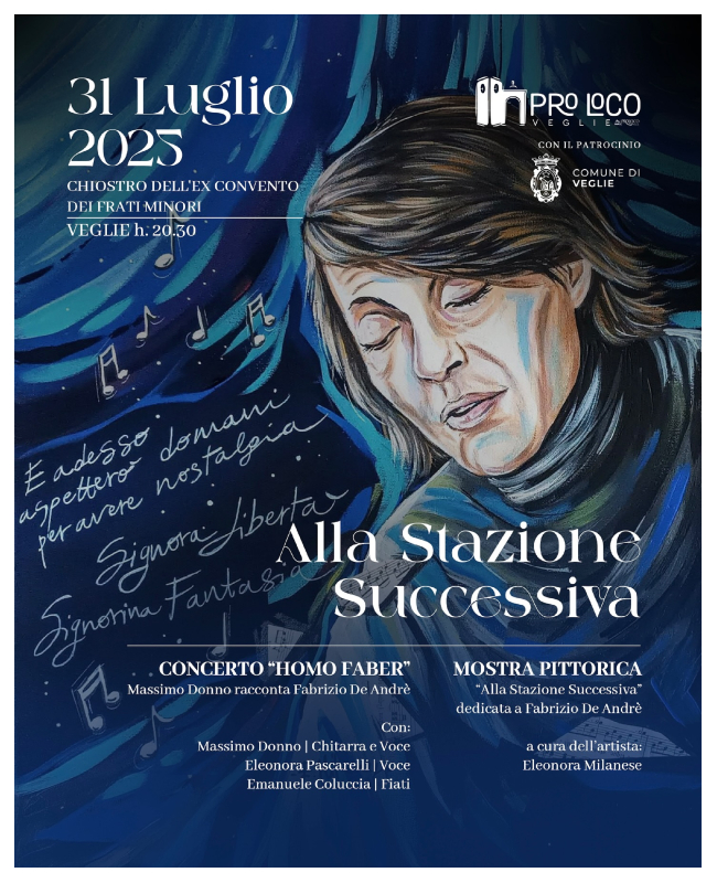 VEGLIE – Si terrà Giovedì 31 Luglio alle ore 20.30 presso il Chiostro dell’ex Convento dei Frati Minori a Veglie l’evento dedicato a Fabrizio de Andrè dal titolo “ALLA STAZIONE SUCESSIVA”.
