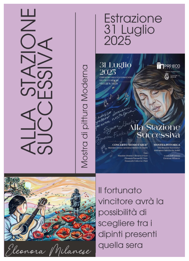 A fine serata ci sarà l’estrazione di uno splendido quadro (70×100) da scegliere tra quelli presenti alla mostra ispirati alle canzoni di Fabrizio De Andrè e realizzati per l’occasione da Eleonora Milanese. I biglietti per l’estrazione sono acquistabili contattando direttamente l’artista.