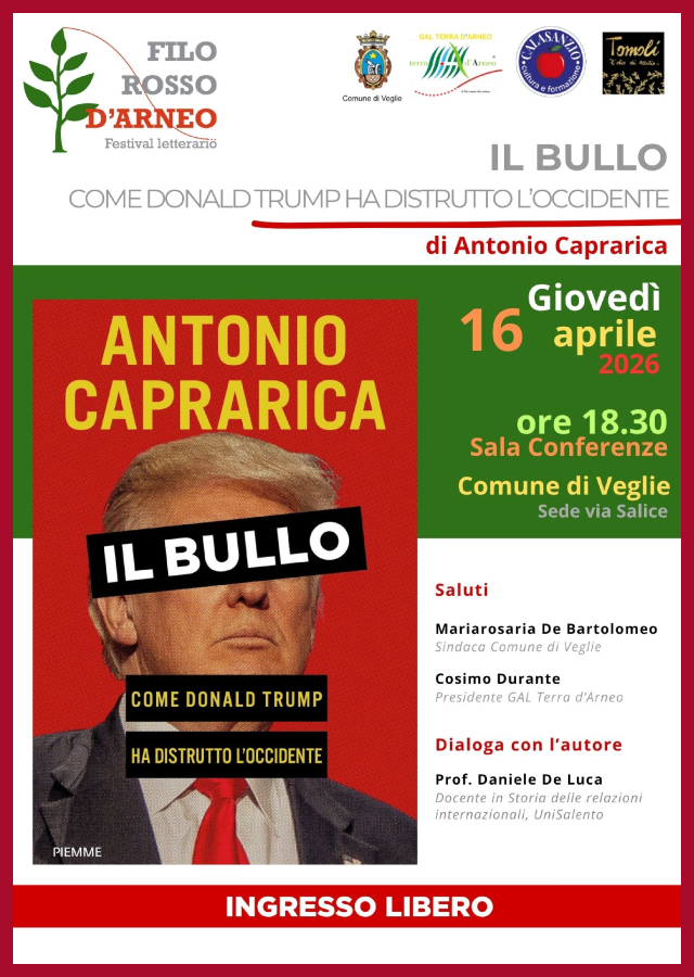 GIOVEDÌ 16 APRILE alle ore 18:30 presso la Sala Conferenze del Comune di Veglie in via Salice sarà presentato il libro “Il bullo. Come Donald Trump ha distrutto l’Occidente” di Antonio Caprarica. Dialoga con l’autore il prof. Daniele De Luca
