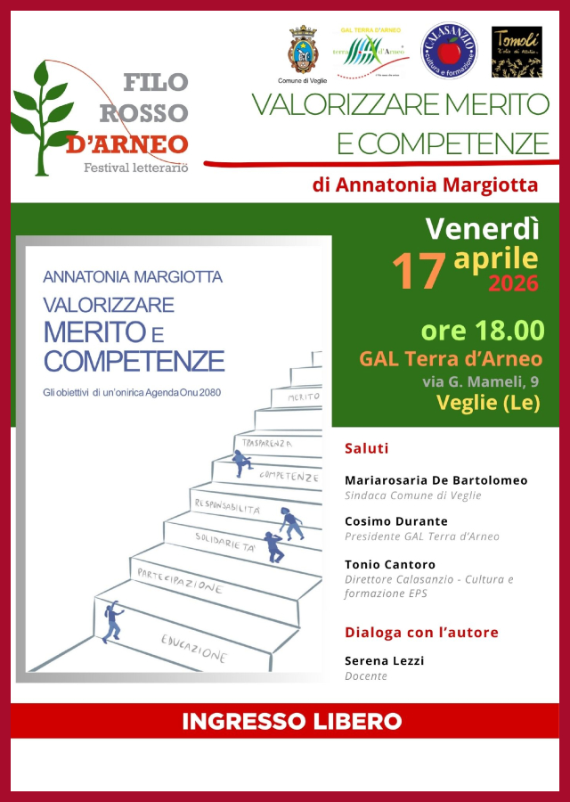 VENERDÌ 17 APRILE alle ore 18:00 presso la sede del GAL Terra d’Arneo in via G. Mameli a Veglie sarà presentato il libro “Valorizzare Merito e Competenze” di Annatonia Margiotta. Dialoga con l’autrice la Prof. Serena Lezzi