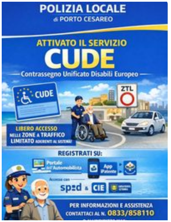 La Polizia Locale del Comune di Porto Cesareo informa la cittadinanza di aver attivato il servizio CUDE – Contrassegno Unificato Disabili Europeo importante strumento nazionale volto a semplificare e agevolare la mobilità delle persone con disabilità su tutto il territorio italiano.