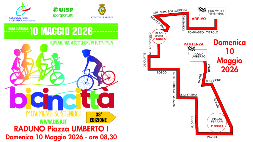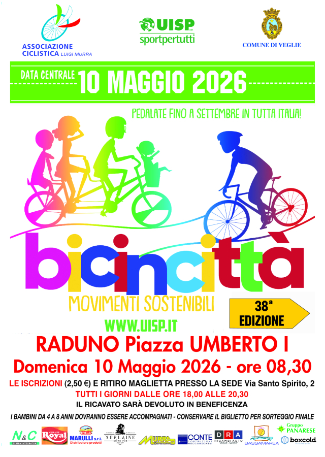 VEGLIE – Tutta Italia si prepara per la 38ª edizione di  Bicincittà, manifestazione nazionale UISP,  che avrà la sua giornata centrale domenica 10 maggio 2026 in contemporanea in più di 100 città in tutta Italia con lo slogan “MOVIMENTI SOSTENIBILI”.