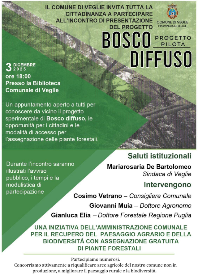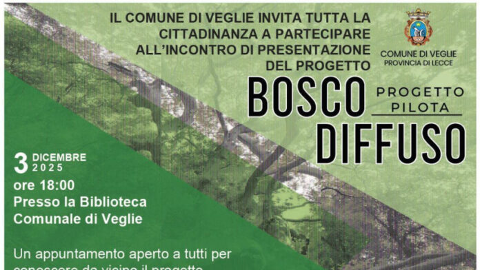 VEGLIE – Il 3 dicembre, alle ore 18, presso la Biblioteca Comunale di Veglie, si terrà l’incontro pubblico di presentazione dell’Avviso del progetto sperimentale “Bosco diffuso”, una nuova iniziativa dell’Amministrazione comunale che prevede l’assegnazione gratuita di essenze forestali autoctone ai proprietari o possessori di terreni agricoli situati nel territorio comunale.