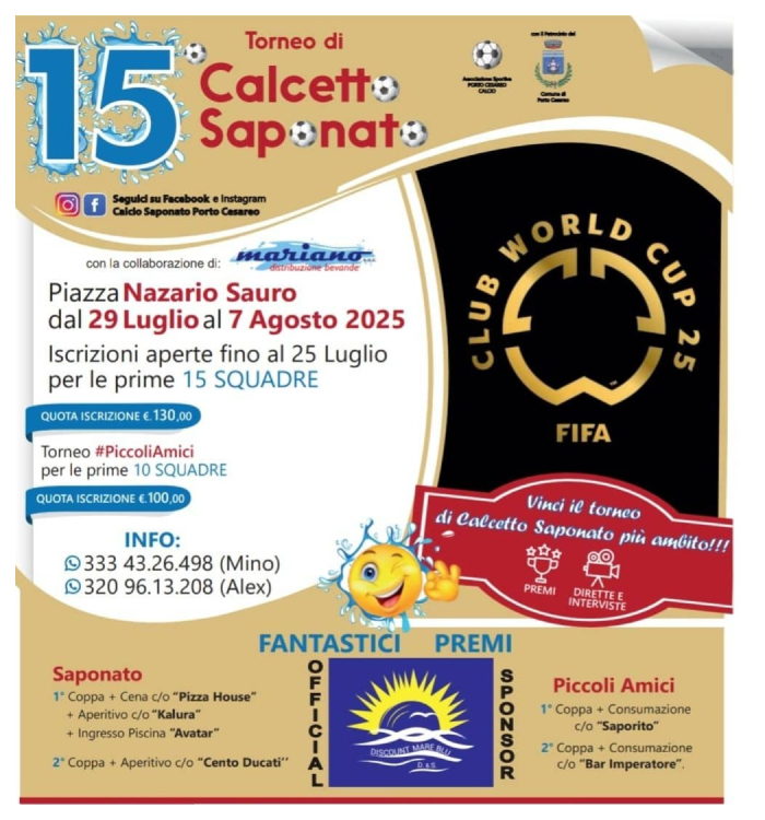 PORTO CESSAREO – Il grande classico dell’estate a Porto Cesareo sta per tornare. La manifestazione “Calcio Saponato” 2025 dal 29 luglio al 7 agosto in Piazza “Nazario Sauro” dalle 21:00, giunge al suo 15° anno di vita.