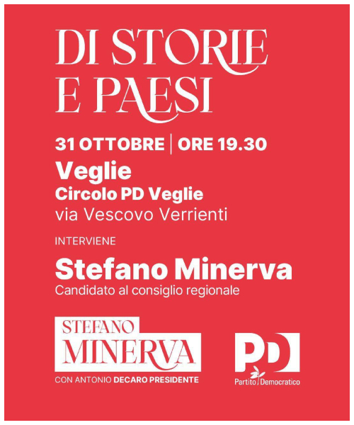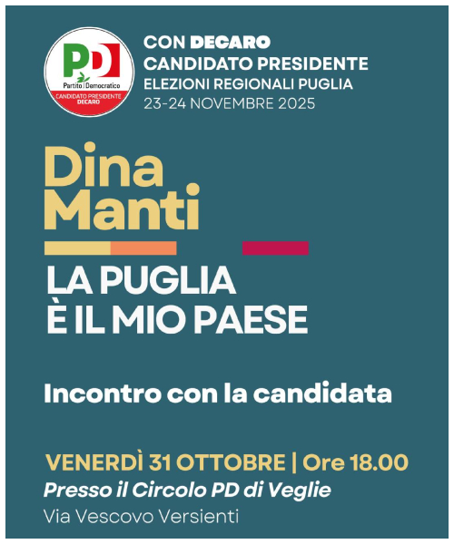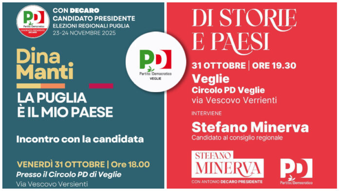VEGLIE – In occasione delle prossime Elezioni Regionali in Puglia del 23 e 24 novembre 2025, il circolo PD di Veglie organizza un incontro con i candidarti del Partito Democratico per Venerdì 31 Ottobre presso la sede del Circolo PD in Via Vescovo Verrienti a Veglie.