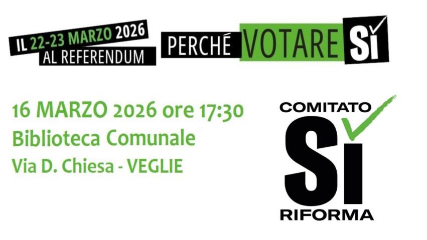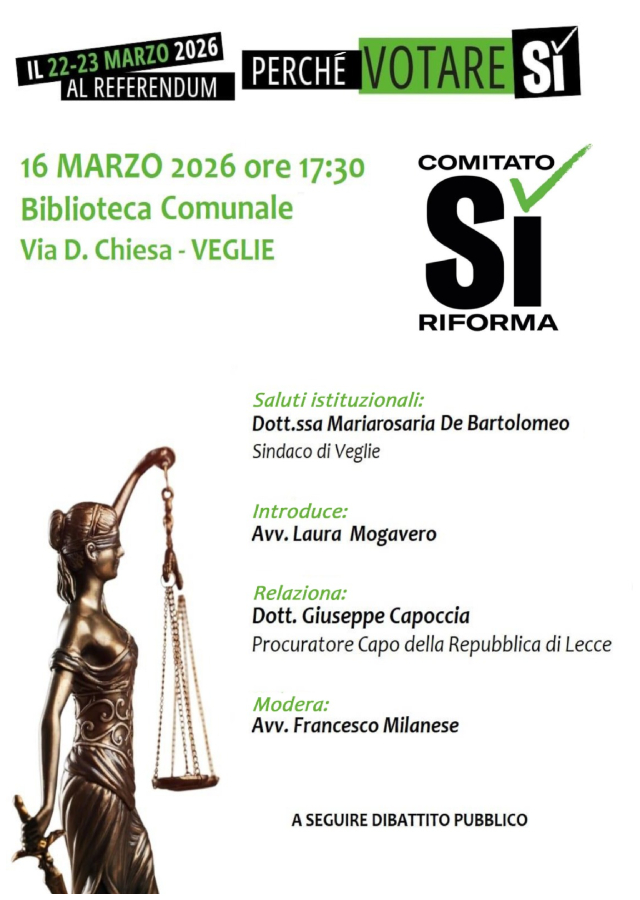 VEGLIE – In occasione del prossimo Referendum Costituzionale del 22 e 23 Marzo 2026, il “COMITATO SÌ RIFORMA” organizza un dibattito pubblico per parlare del Referendum della Giustizia e per spiegare le ragioni del SÌ.