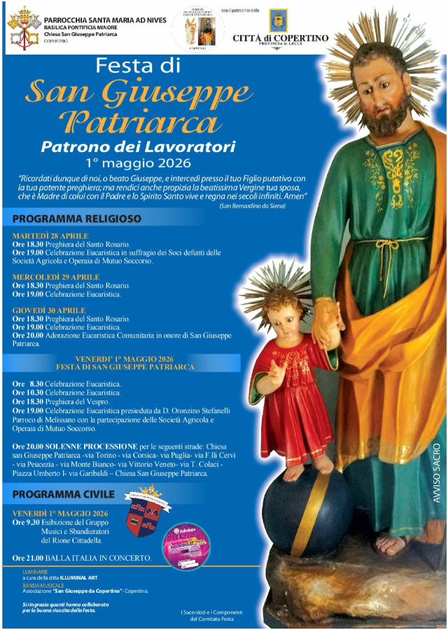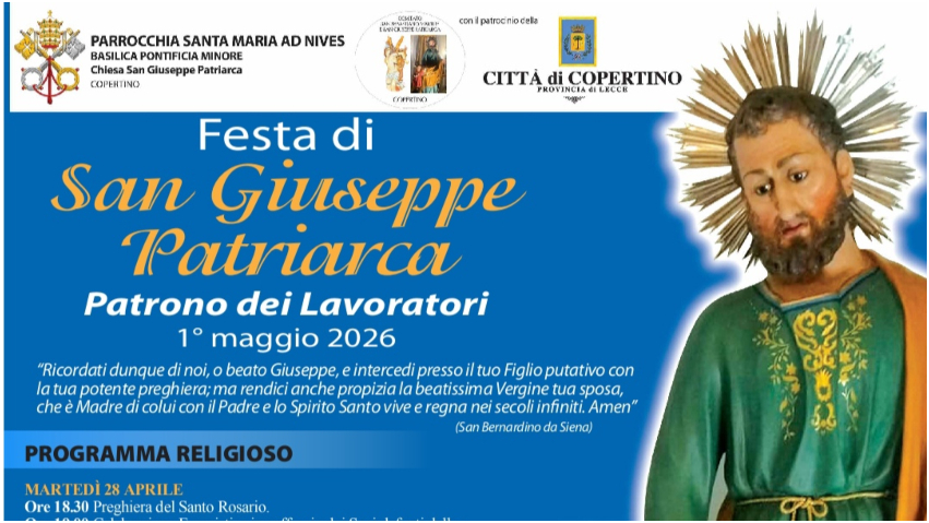 Di seguito il programma della “Festa di San Giuseppe Patriarca Patrono dei Lavoratori” che si terrà a COPERTINO (LE) Venerdì 1 maggio 2026