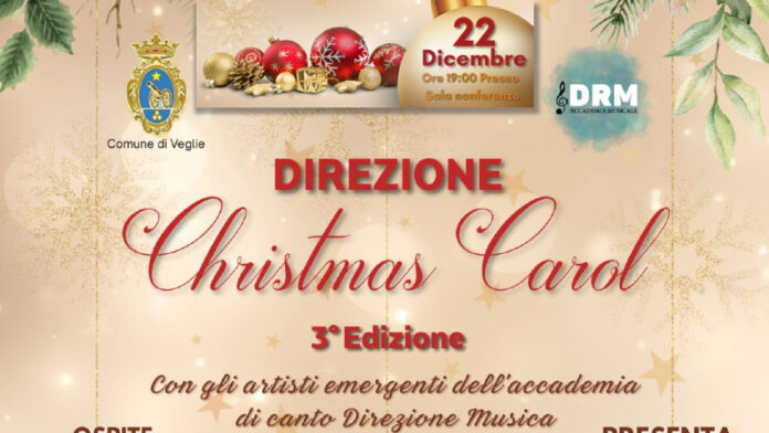 VEGLIE – Si terrà Lunedì 22 Dicembre 2025 alle ore 19.00 presso la Sala Conferenze di via Salice a Veglie la 3ª edizione del concerto di Natale dal titolo “DIREZIONE CHRISTMAS CAROL” dell’Accademia Musicale DRM del Maestro Adriano Patera.