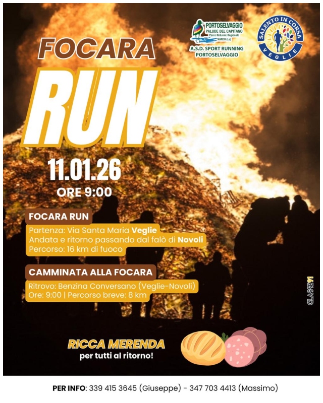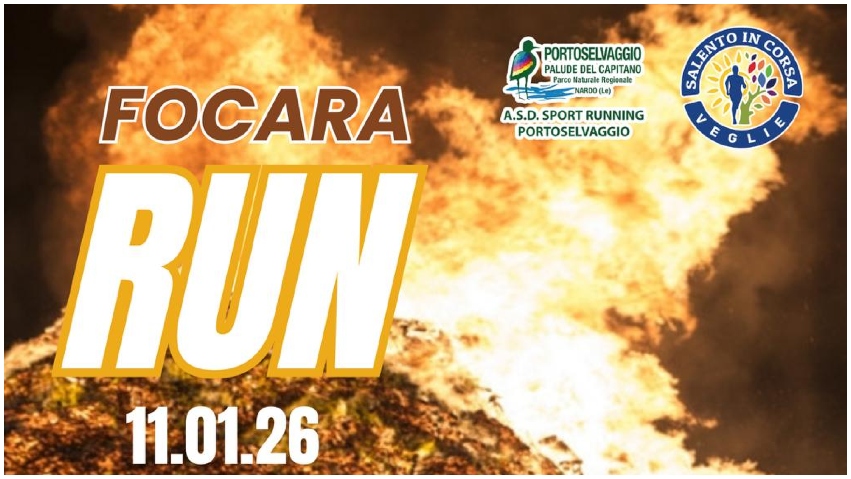 VEGLIE / NOVOLI – Ritorna Domenica 11 Gennaio 2025 alle ore 9.00 la nuova edizione di “FOCARA RUN 2026” organizzata da “Salento in Corsa Veglie” e “Sport Running Porto Selvaggio”.