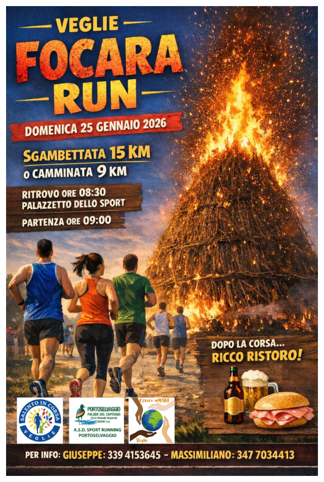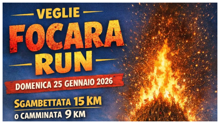 VEGLIE – Domenica 25 Gennaio 2026 alle ore 8.30 inizia il ritrovo per l’edizione di “FOCARA RUN VEGLIE 2026” organizzata da “Salento in Corsa Veglie” , “Sport Running Porto Selvaggio” e “Associazione Essere uMani”