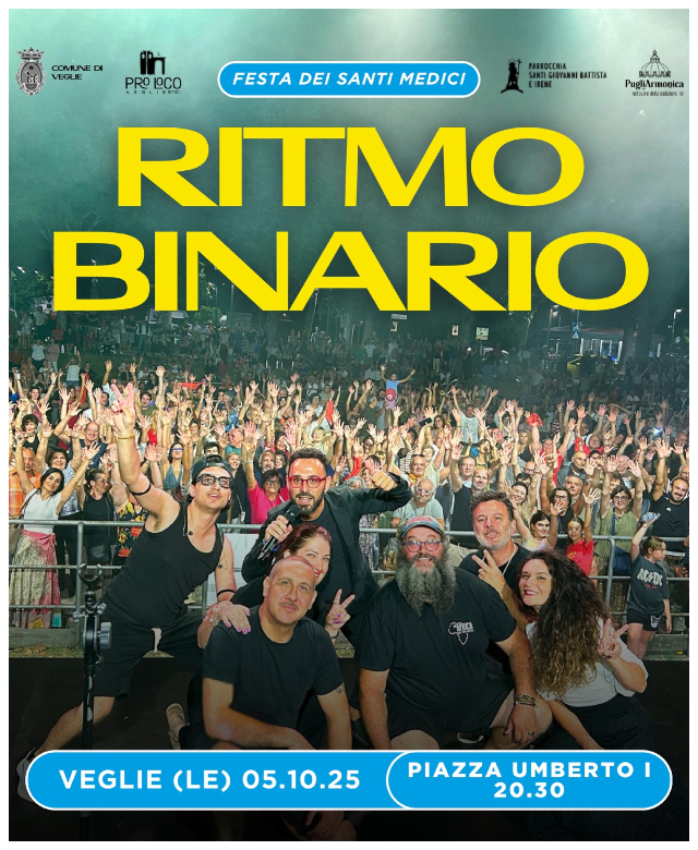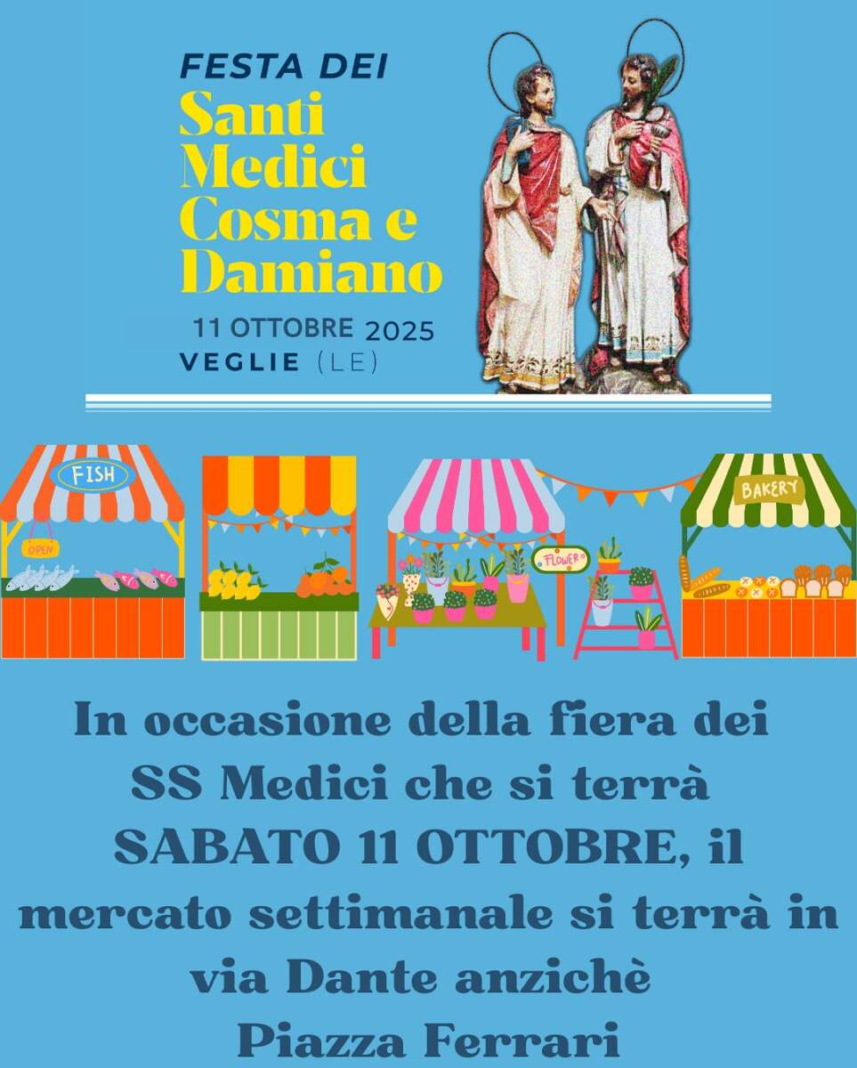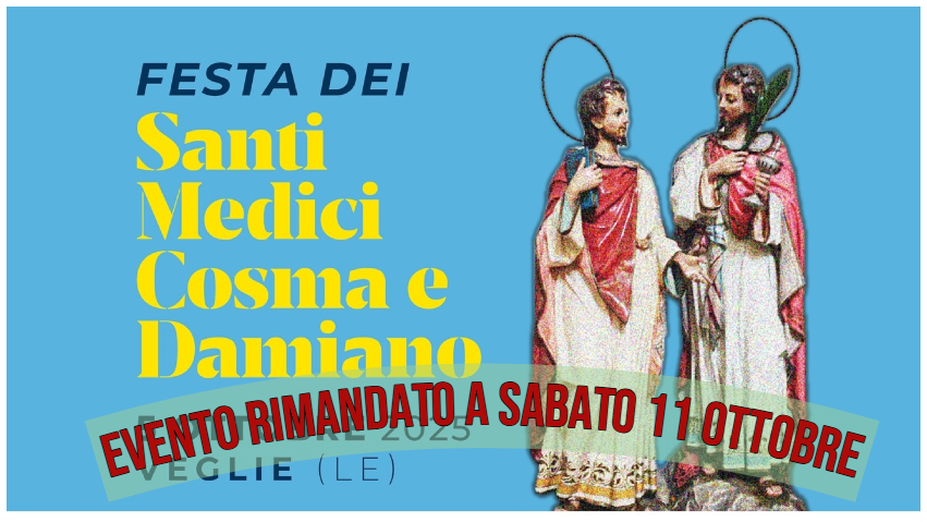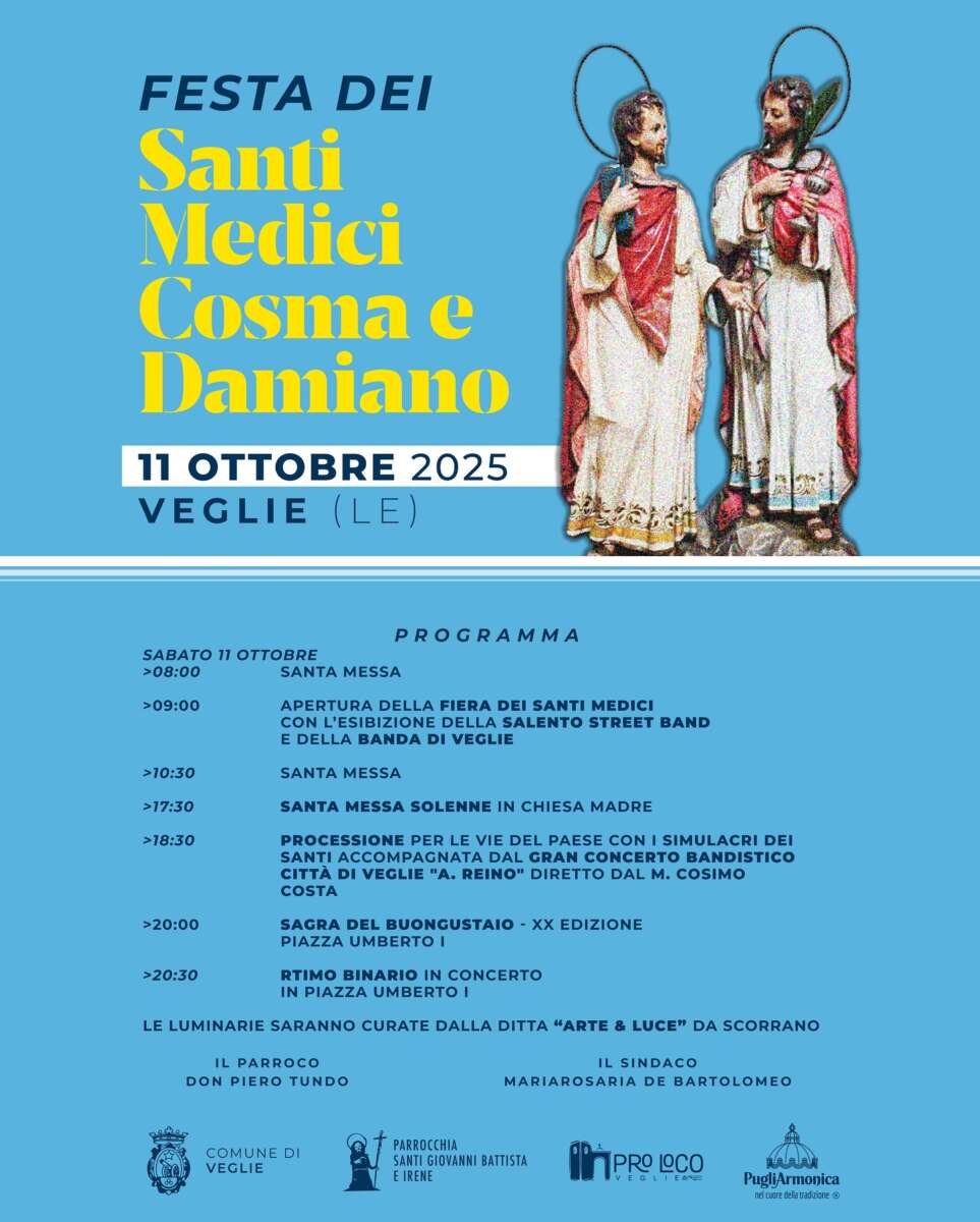 La Parrocchia SS. Giovanni Battista e Irene,  il Comune di Veglie, la  Pro Loco Veglie APS e PugliArmoica organizzano per Domenica 5 Sabato 11 Ottobre 2025 a  Veglie (LE) la tradizionale  “Festa dei Santi Medici Cosma e Damiano”.