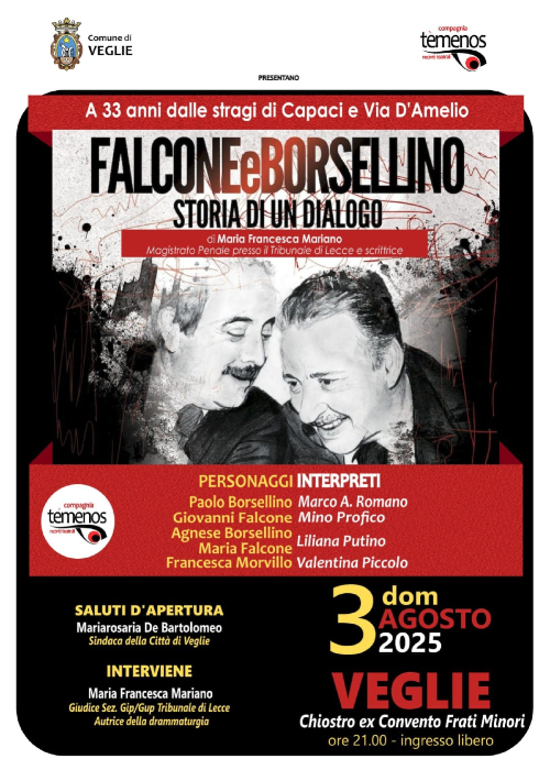 Spettacolo teatrale “Falcone e Borsellino, storia dei un dialogo” a cura dell’Ass. Culturale Teatrale “Recinti Temenos ETS”.