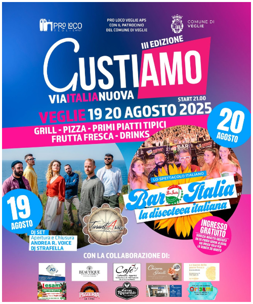 Evento enogastronomico e musicale organizzato dalla Pro Loco denominato “Gustiamo Via Italia Nuova – Food – Drink – Music” con il Patrocinio del Comune di Veglie. Link Articolo: >>> «GustiAmo Via Italia Nuova 3ª edizione» Food, Drink & Music a Veglie Martedì 19 e Mercoledì 20 Agosto 2025