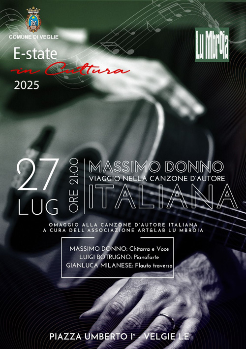“Omaggio alla canzone d’autore italiana” a cura dell’Associazione Art&Lab Lu Mbroia. Con Massimo Donno chitarra e voce, Luigi Botrugno pianoforte, Gianluca Milanese flauto traverso.