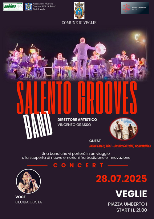 Concerto della “Salento Grooves Band”: Un viaggio alla scoperta di nuove emozioni tra tradizione e innovazion. Direttore Artistico VINCENZO GRASSO. Alla voce CECILIA COSTA. Ospite speciali della serata vegliese DARIA FALCO alla voce e BRUNO GALEONE alla fisarmonica.