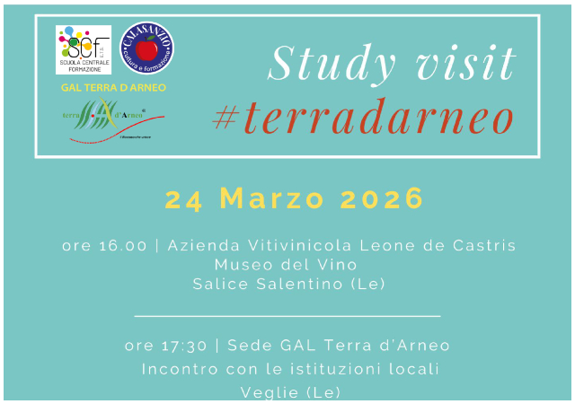 Dopo una mattinata a conoscere da vicino la formazione professionale in ambito gastronomico e le numerose attività svolte da Calasanzio – Cultura e Formazione ETS, il gruppo sarà accompagnato presso la sede della storica cantina Leone de Castris a Salice Salentino dove potrà conoscere una storia familiare di eccellenza legata alle produzioni vinicole locali. A seguire incontro presso la sede del GAL Terra d’Arneo, a Veglie, per incontrare le istituzioni locali e conoscere da vicino le attività dei GAL quale presidio europeo sui territori.
