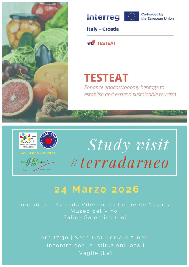 La Terra d’Arneo si conferma laboratorio di innovazione e sostenibilità nel settore enogastronomico, luogo scelto per la visita di studio organizzata nell’ambito del progetto europeo Interreg Italia-Croazia “TESTEAT – Enhance enogasTronomy hEritage to eSTablish and Expand sustainAble Tourism”.