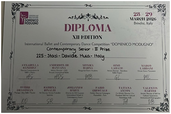 Oltre al secondo posto, il giovane danzatore ha ottenuto anche importanti borse di studio per la sua formazione artistica: Borsa di Studio Atelier Paris&Italie, Barcelona Dance Project Summer Intensive, 100% experimental week presso Corservatorio Annarella Sanchez, 100% Dance workshop Festival Catania; opportunità che gli permetteranno di continuare il suo percorso di crescita confrontandosi con realtà e insegnanti di livello internazionale.