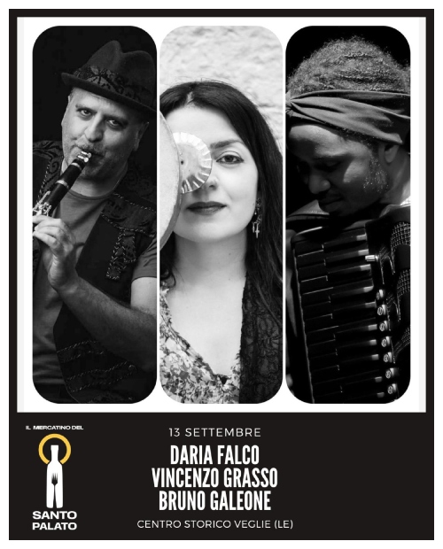 DARIA FALCO, VINCENZO GRASSO & BRUNO GALEONE – Voce, tamburi a cornice, clarinetto e fisarmonica si intrecciano in un dialogo che attraversa confini e culture. Daria Falco e Bruno Galeone — già un duo affermato nella world music — si uniscono al clarinetto e alla sensibilità di Vincenzo Grasso per dare vita a un viaggio musicale che fonde le tradizioni dei popoli in un’unica, intensa armonia. Dal Mediterraneo all’Est Europa, dalle sonorità popolari alle contaminazioni jazz, ogni brano diventa un ponte tra storie e terre lontane.