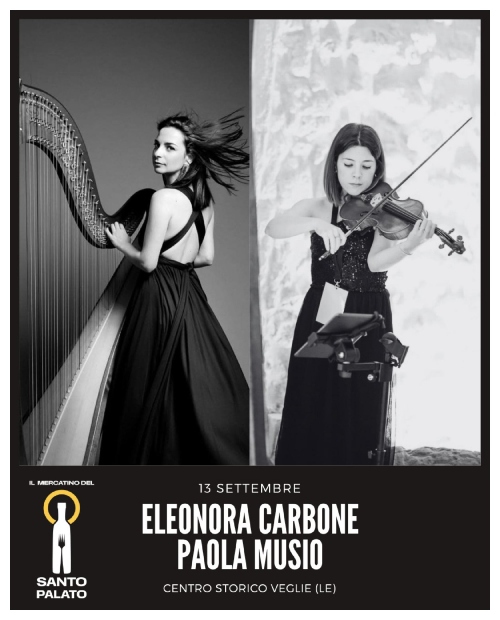 ELEONORA CARBONE (ARPA) & PAOLA MUSIO (VIOLINO) – Due artiste, due strumenti, un’unica voce musicale. L’arpa raffinata e versatile di Eleonora Carbone incontra il violino appassionato e rigoroso di Paola Musio, creando un intreccio sonoro che unisce la delicatezza del classico alla curiosità del contemporaneo. Dai palchi di Roma, Milano e Firenze alle esibizioni internazionali, fino all’esperienza orchestrale e pedagogica: il loro incontro sul palco del Mercatino del Santo Palato è un viaggio di eleganza, emozione e tecnica.