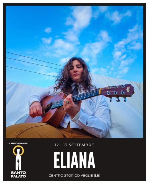 ELIANA – Giovane cantautrice salentina, Eliana porta sul palco sonorità che viaggiano tra l’indie, l’urban e il pop. Con chitarra, voce e loop station, regala un repertorio ampio che spazia dai successi italiani e internazionali — riarrangiati in chiave acustica — ai suoi brani originali. Tra questi, il nuovo singolo “Senza direzione”, pronto a risuonare tra le vie del centro storico durante il Mercatino del Santo Palato.