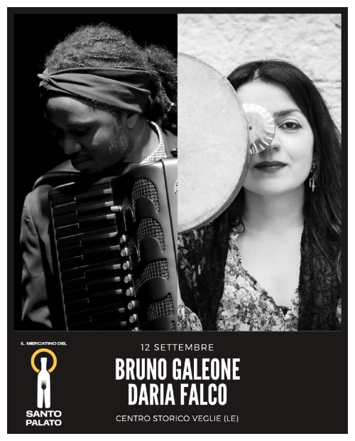 DARIA FALCO & BRUNO GALEONE – Una voce che racconta il Mediterraneo e una fisarmonica che ne disegna le onde: Daria Falco e Bruno Galeone portano in scena un viaggio musicale che attraversa il Sud Italia e abbraccia il mondo. Canti tradizionali, sonorità jazz e balkan, atmosfere che passano dalla Francia a Cuba, dalla Romania al Salento, fondendosi in un’unica emozione. Un incontro di eleganza, ricerca e passione che rende ogni nota un racconto.