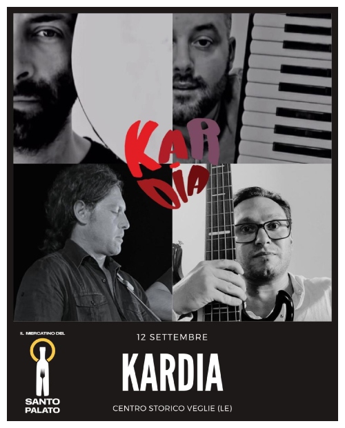 KARDIA – Quattro giovani musicisti uniti dalla pizzica e dal cuore del Salento. Il loro suono pulsante intreccia radici e innovazione, trasformando ogni concerto in un viaggio di memoria e passione.