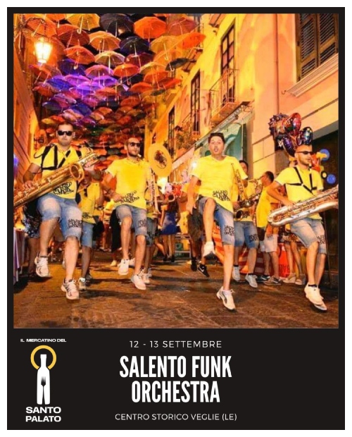 SALENTO FUNK ORCHESTRA – Tre sassofoni, un susafono, trombe, tromboni e percussioni: una vera macchina da groove che accende le strade con la potenza dei fiati e il ritmo travolgente della black music. La Salento Funk Orchestra nasce dallo spirito delle street band: energia, contaminazione e festa senza confini, dove vicoli e piazze si trasformano in un palcoscenico condiviso di musica e movimento. Uno spettacolo che è musica da ballare e da vivere, un’esplosione di entusiasmo che porta in piazza il calore del Salento.