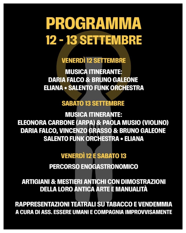 Nelle serate del 12 e 13 è prevista inoltre la rappresentazione teatrale live della vendemmia e della raccolta del tabacco in ogni suo momento a cura della compagnia “Improvvisamente” e della’Associazione “EssereUmani”.