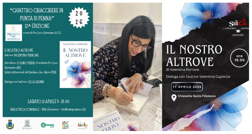 Mentre continua a mantenersi tra le posizioni più alte delle classifiche bestseller di Amazon, “Il nostro altrove”, il nuovo romanzo della scrittrice salentina Valentina Perrone, torna protagonista in due nuovi appuntamenti pubblici in programma nei prossimi giorni nel Salento.