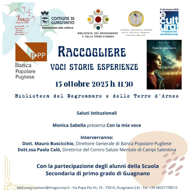 La mattina del 15 ottobre, infatti, alle ore 11:30, grazie alla partecipazione attiva e il sostegno di Banca Popolare Pugliese, ospite a Guagnano sarà Monica Sabella, autrice del libro “Con la mia voce”, (AG Book Publishing) che racconta le dinamiche e le conseguenze del fenomeno allarmante del bullismo e del grido di dolore che può scatenare e che spesso resta inascoltato, perso fra i meandri della solitudine e dell’emarginazione.