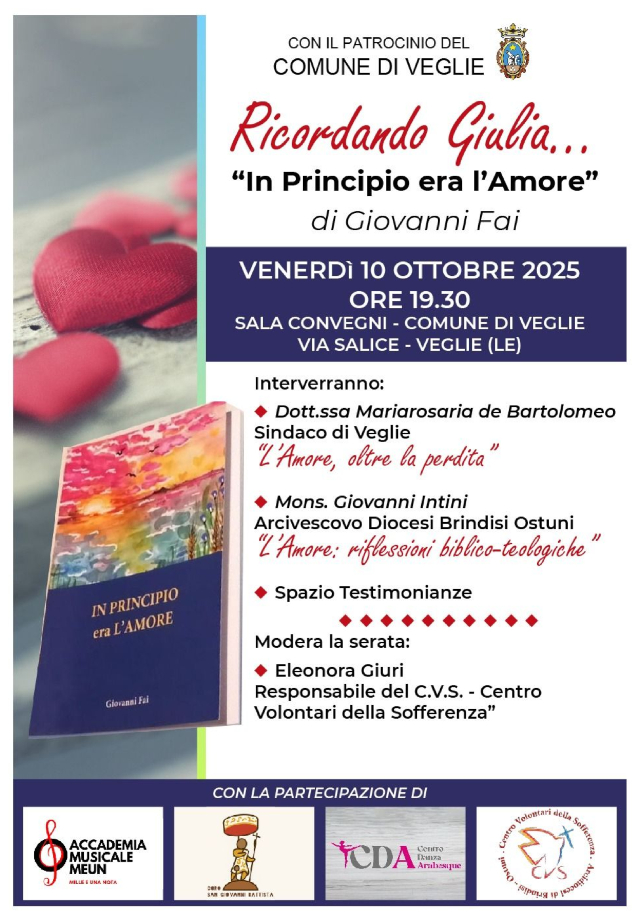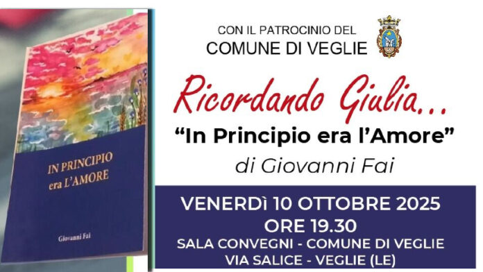 VEGLIE – Si terrà Venerdì 10 Ottobre 2025 alle ore 19.30 presso la Sala Convegni del Comune di Veglie in via Salice l’evento “RICORDANDO GIULIA” con la presentazione del libro di Giovanni Fai dal titolo “IN PRINCIPIO ERA L’AMORE”.