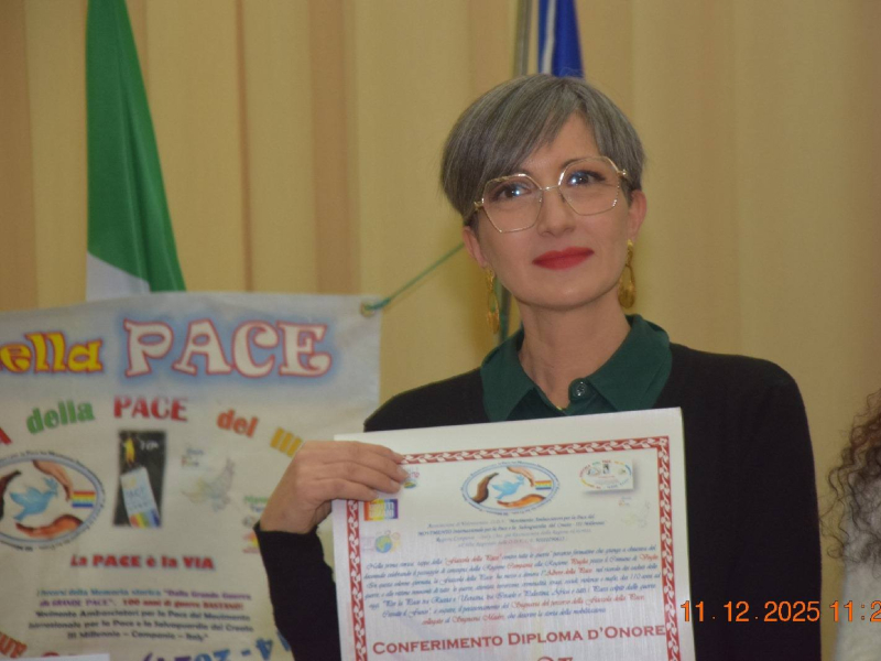 Alla prof.ssa Clementina Vetrano, il Movimento internazionale per la Pace l’ha nominata referente del progetto di Pace in Puglia consegnandole la nomina speciale di “Ambasciatrice della Fiaccola della Pace”.