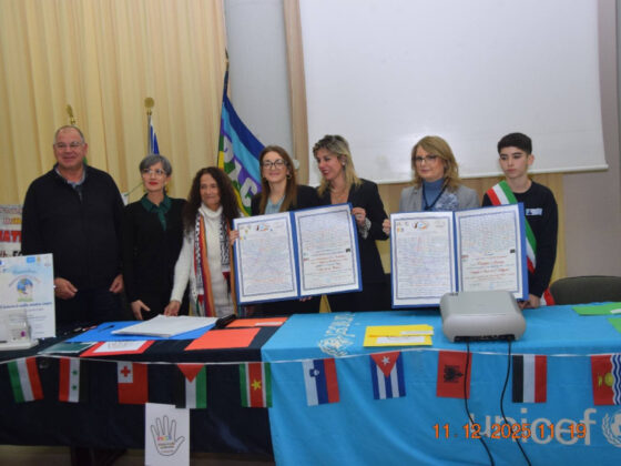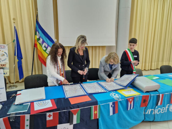 Hanno firmato la Dirigente scolastica Savoia, la Sindaca De Bartolomeo, la Presidente del Consiglio comunale Federica Guido e la Presidente del Movimento Internazionale per la Pace Agnese Ginocchio.
