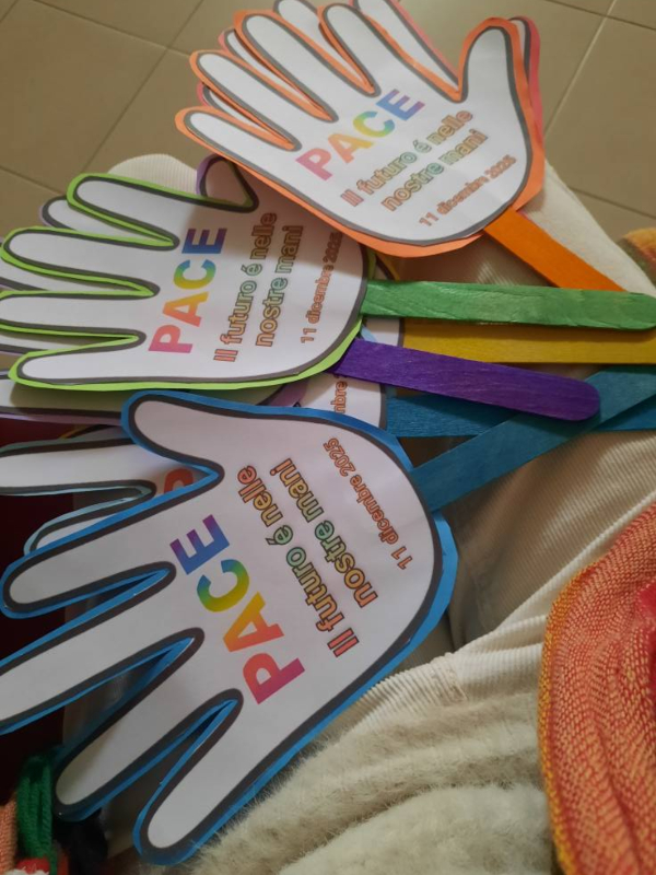 La Scuola ed il Comune hanno omaggiato la Presidente del Movimento per la Pace del dono di una bellissima luminaria che compone la parola “Pace” con le luci che richiamano i colori della Pace.