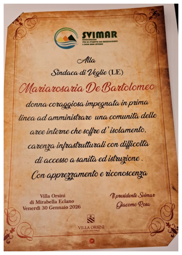 La sindaca di Veglie Mariarosaria De Bartolomeo, ha ricevuto un riconoscimento a Mirabella Eclano (AV) per l’impegno come amministratrice, nell’ambito di un evento dedicato al ruolo e alle prospettive delle aree interne del Paese, organizzato da SVIMAR (Associazione per lo Sviluppo del Mezzogiorno e delle Aree Interne) con il patrocinio del Ministero dell’Interno.