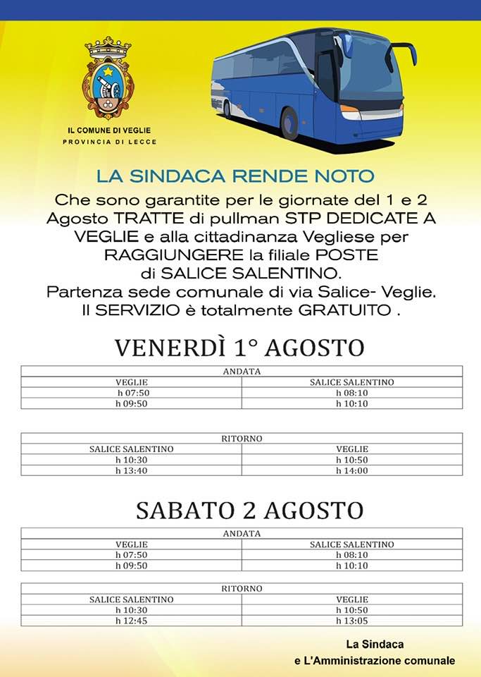 per i giorni 1 e 2 agosto prossimi sarà garantito un servizio navetta gratuito di STP per le cittadine e i cittadini vegliesi che raggiungeranno l’ufficio postale sostitutivo di riferimento, a Salice Salentino.