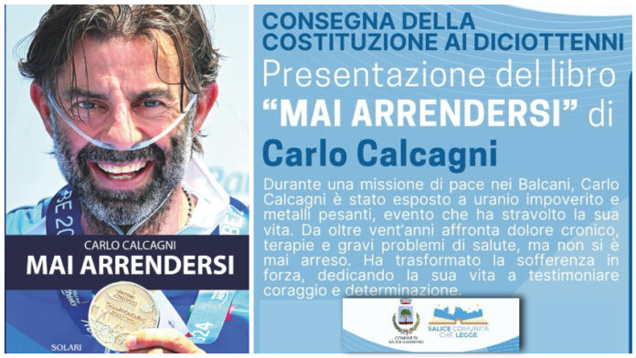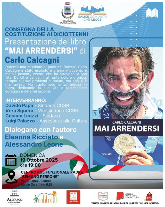 SALICE SALENTINO – Domenica 19 ottobre 2025, alle ore 19:00, presso il Centro Polifunzionale Padre “Benigno Perrone” di Salice Salentino, per “Salice Comunità che Legge”, si terrà un incontro speciale all’insegna della forza, del coraggio e della vita. L’occasione sarà la presentazione del libro “Mai arrendersi”, scritto dal Colonnello Carlo Calcagni, esempio vivente di resilienza e determinazione.