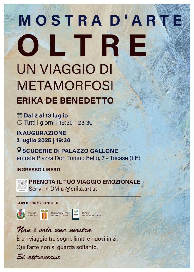 TRICASE (LE) – Dopo il grande successo della prima tappa, l’artista Erika De Benedetto torna con “OLTRE – Un viaggio di metamorfosi”, il cui cammino prosegue dal 2 al 13 luglio nelle storiche Scuderie di Palazzo Gallone a Tricase. La seconda tappa di questo acclamato progetto artistico, iniziativa patrocinata dal Comune di Tricase e dalla Provincia di Lecce – Salento d’Amare, è inserita nel cartellone ufficiale di eventi estivi “Tricase Emozioni a Levante”. L’evento si conferma non come una semplice mostra, ma come un percorso immersivo e di riflessione, che in questa nuova veste si arricchisce di opere inedite tutte da scoprire.