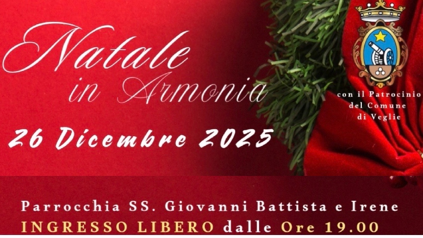 VEGLIE – Si terrà Venerdì 26 Dicembre 2025 alle ore 19.30 presso la chiesa dei SS. Giovanni Battista e Irene il concerto dal titolo “Natale in Armonia” dell’ Accademia musicale MEUN diretta dal M° Vito Stefanizzi in collaborazione con il coro interparrocchiale “San Giovanni Battista”.