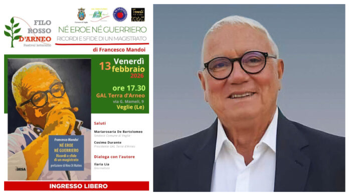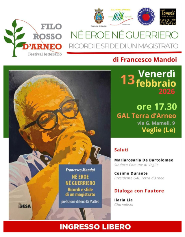 Secondo incontro per il Festival letterario “Filo Rosso d’Arneo”, che venerdì 13 febbraio 2026, alle ore 17.30, presso la sede del GAL Terra d’Arneo (via G. Mameli, 9 – Veglie), ospiterà la presentazione del libro “Né eroe né guerriero. Ricordi e sfide di un magistrato” di Francesco Mandoi.